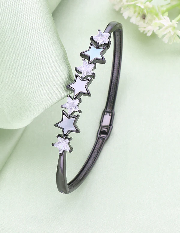 This Designer MOP Black Polish Bracelet is made with high-quality MOP and boasts a chic black polish. Its free size makes it perfect for all party wear, adding a touch of style to any outfit. Elevate your accessories game with this sophisticated and versatile bracelet.