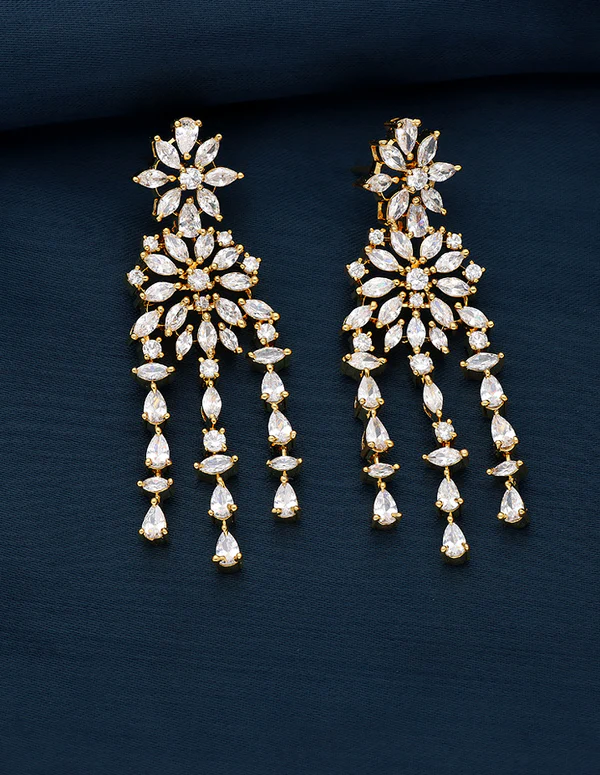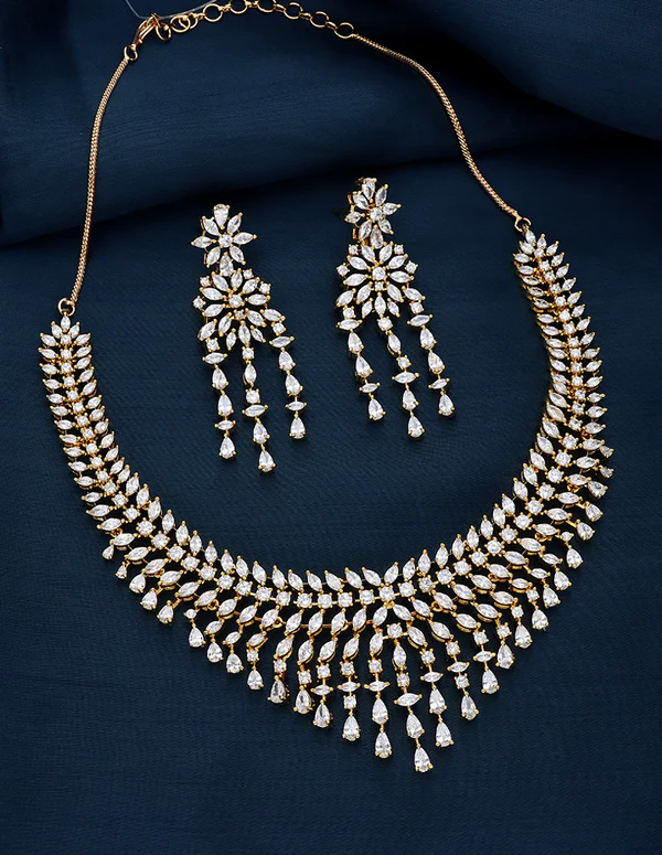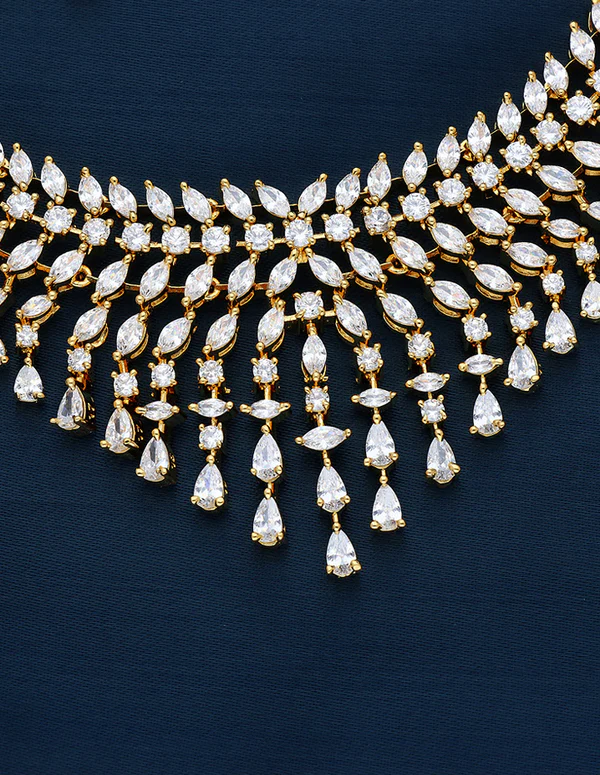 This Designer Gold Polish Zirconia Necklace Set is the perfect accessory for elegant occasions. The beautiful combination of white AD stones adds a touch of sophistication to any outfit. Crafted with a high-quality Gold polish, this necklace set is sure to make a statement.
